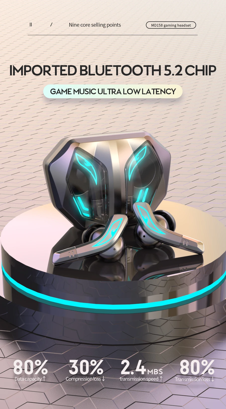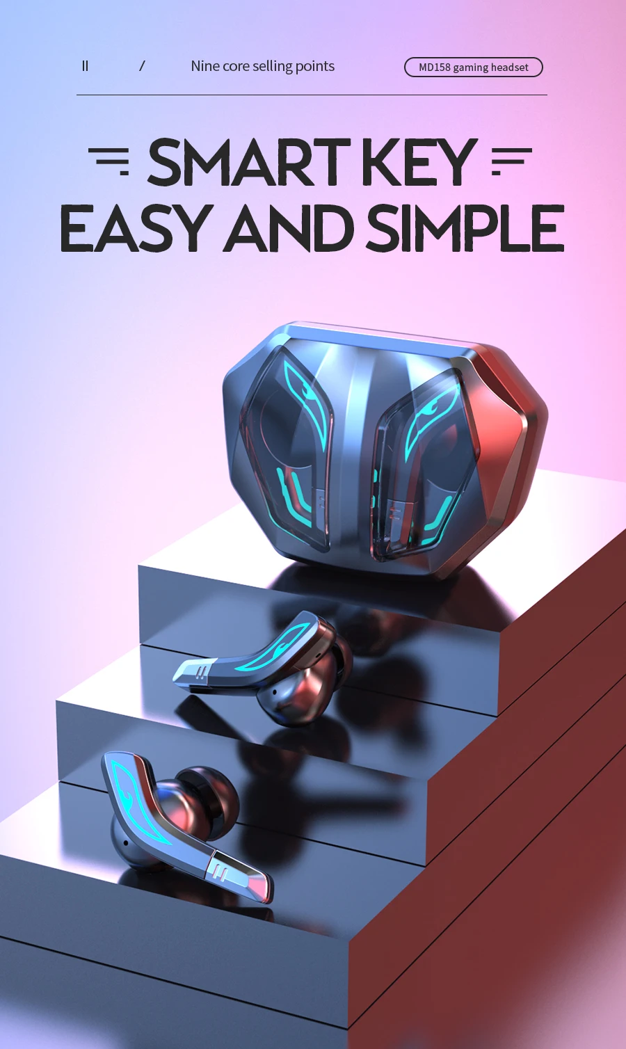 مدل MD158 برای گیمرها و علاقهمندان به تجربه صوتی پرانرژی طراحی شده. بلوتوث نسخه 5.0، زمان پاسخدهی پایین و پخش موسیقی تا ۵–۷ ساعت، از ویژگیهای برجسته آن هستند. باتری 300mAh، نمایشگر LED، مقاومت استاندارد IPX5 در برابر آب و نورپردازی استثنایی باعث میشود این محصول برای توزیع عمده در بازارهای منطقهای با سود خالص بالا، انتخابی متمایز و پایدار باشد.