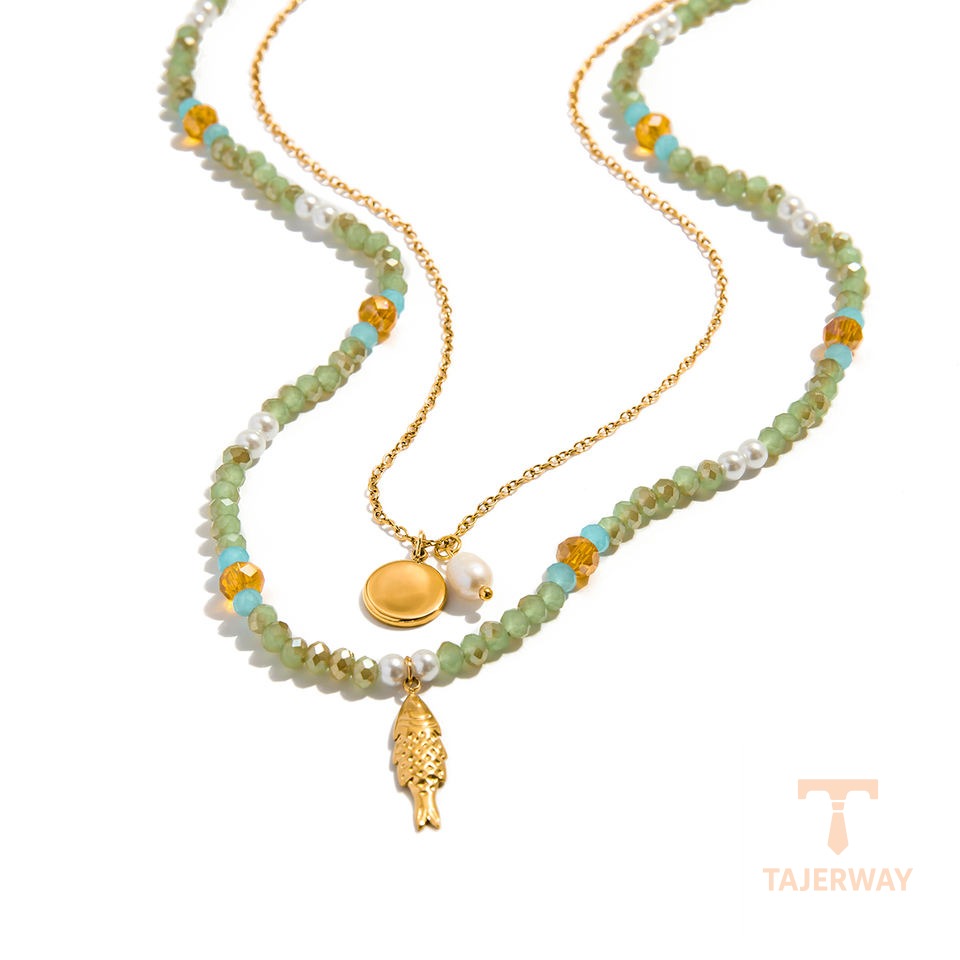 این گردنبند از استیل ضدزنگ با آبکاری طلای ۱۸ عیار ساخته شده و دارای نگین شیشهای است.