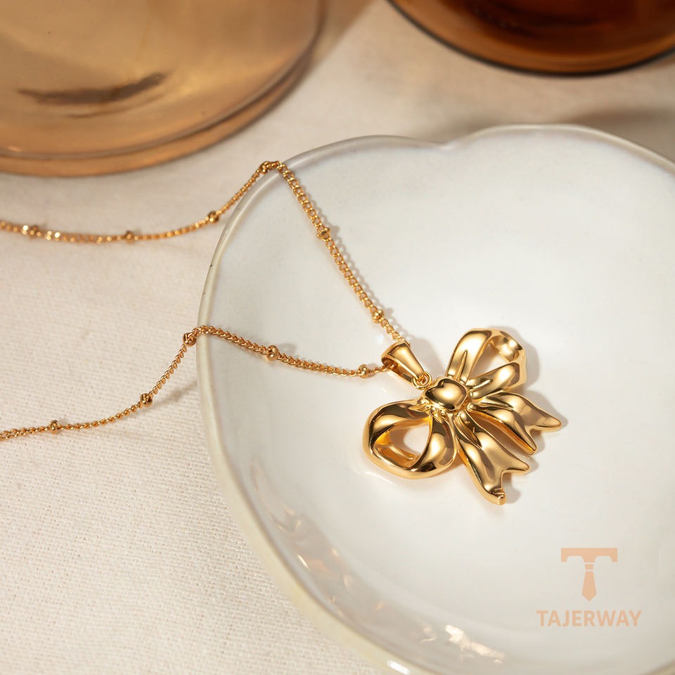 گردنبند پلاکدار پاپیونی با آبکاری طلای ۱۸ عیار و استیل ضدزنگ J&D